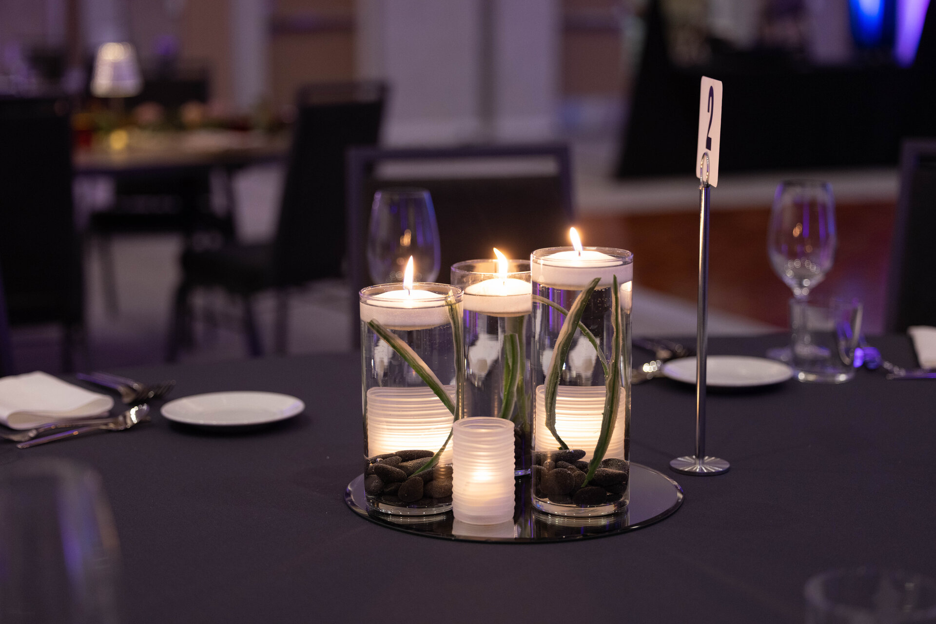 - Complimentary dark gray scuba table linens