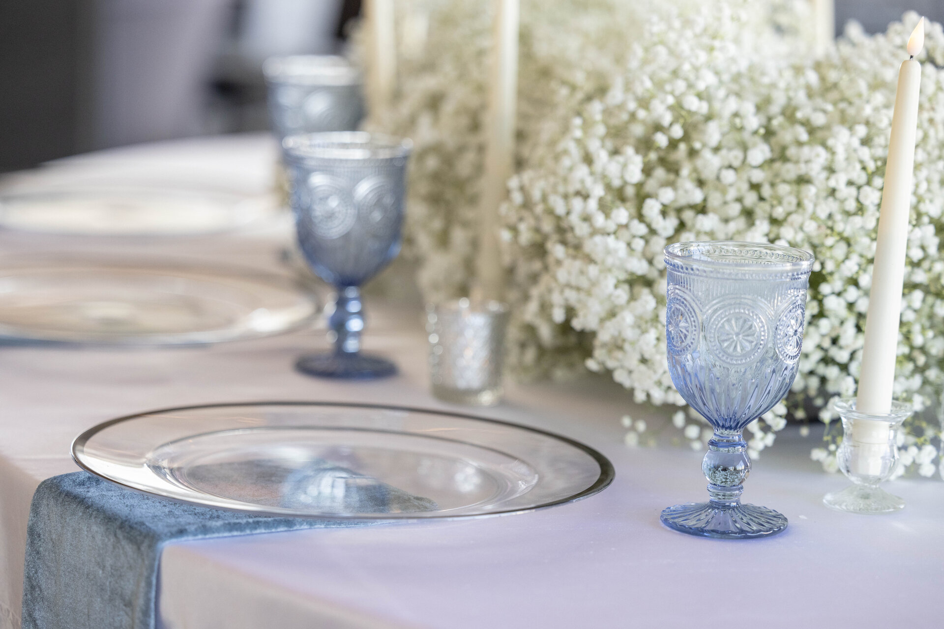 - Linen-less tables, chairs, flatware, napkins, candles, mirrors, and glassware included